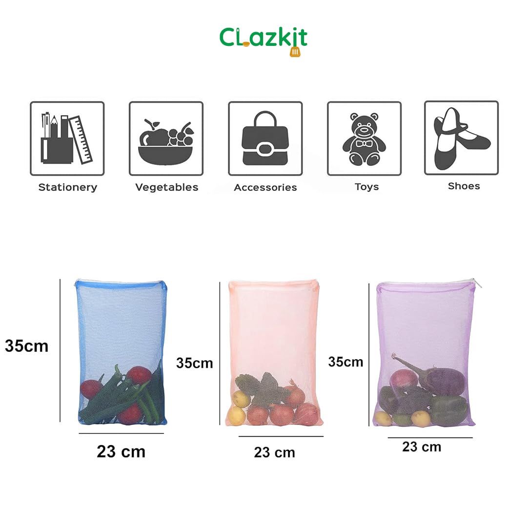 Clazkit Set Of 6 Reusable Fridge Storage Bags For Vegetables and Fruits Dual Layer Mesh Net Multipurpose Multi-Size Kitchen Storage Bags Organizer with Sturdy Zipper