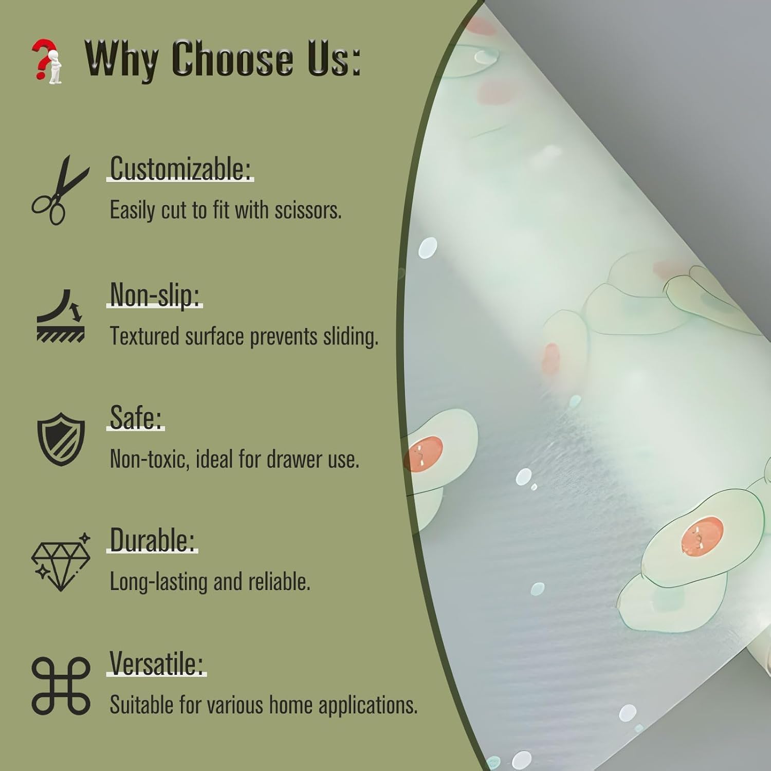 I’m so glad I bought this! Its made cleaning so much easier and spills don’t stain the pantry draws!I picked the cute leafy designs which add a pop of colour to the draws.Its durable, slip resistant, has multiple uses and is nice and thick in size.