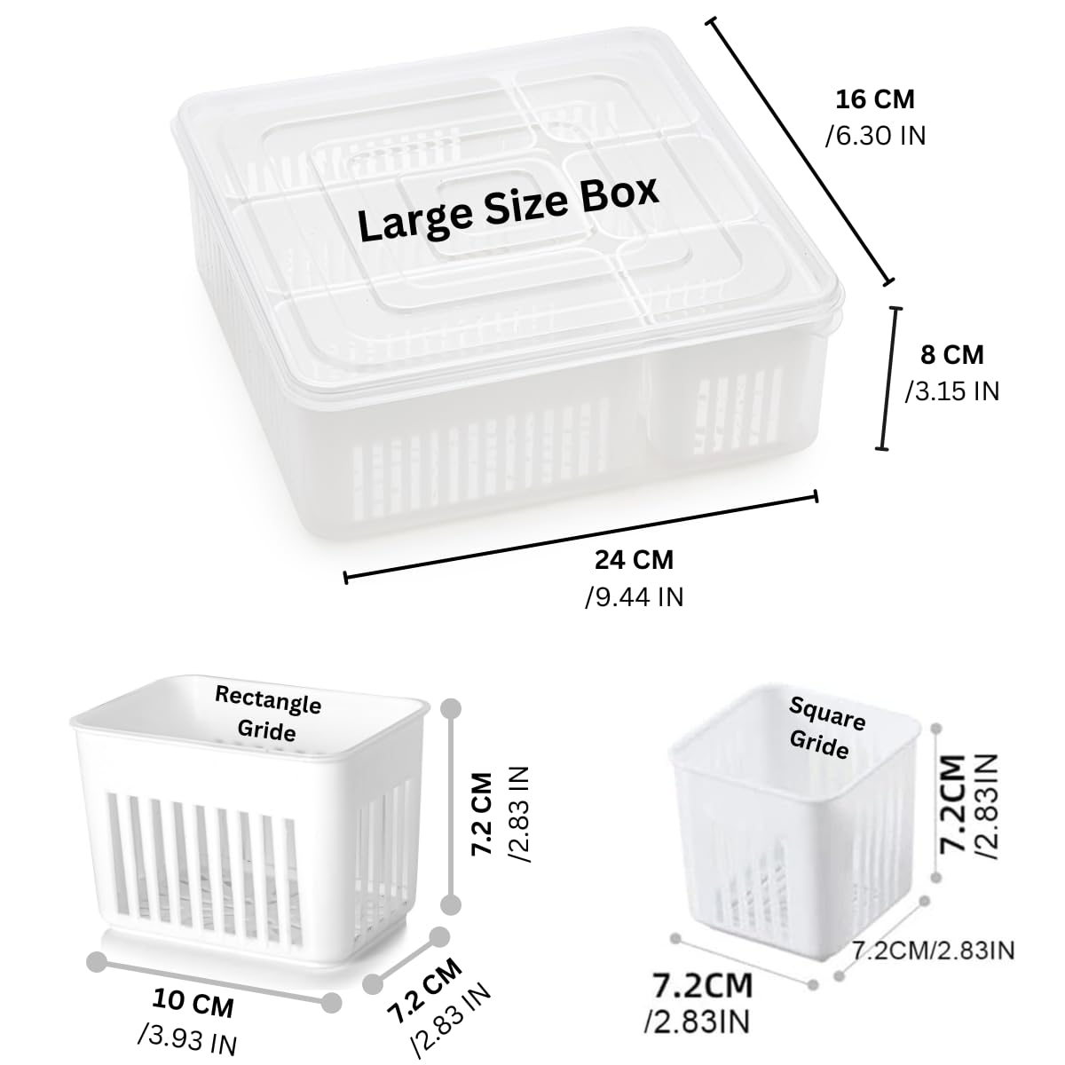 Whether you’re storing fresh berries, leafy greens, or crunchy carrots, our Refrigerator Storage Boxes keep your produce at its best. Simply rinse your items in the drain basket, close the lid, and store them in the fridge. The clear design allows you to see the contents at a glance, making it easy to find what you need.