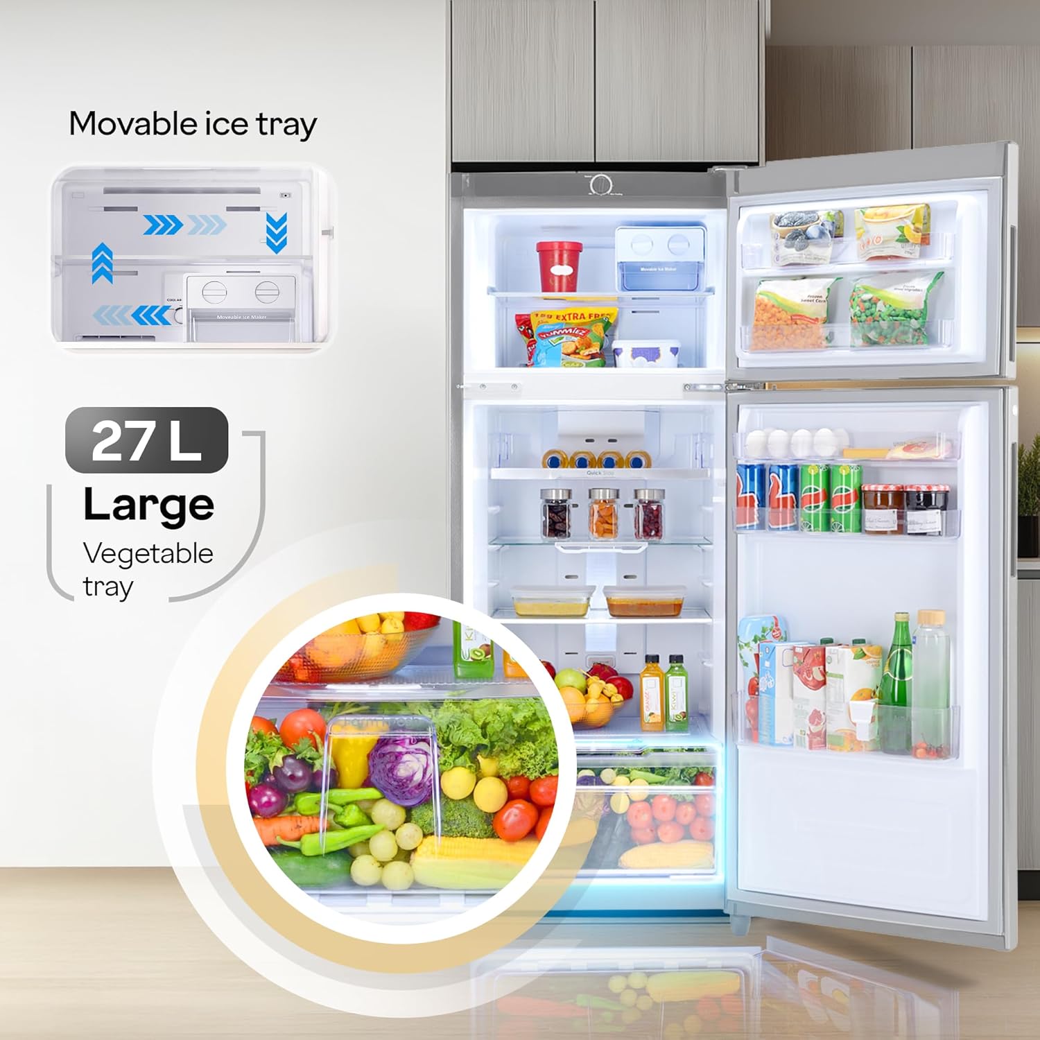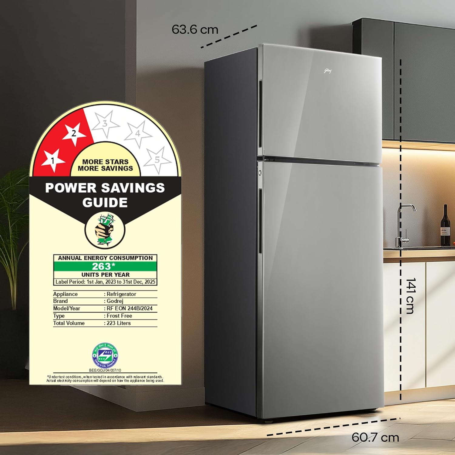 Godrej 223 L 2 Star | AI Powered | 95%+ Food Surface Disinfection | Uniform 360° Cooling | Cool Balance Technology | Inverter Frost Free Double Door Refrigerator (RF EON 244B RI ST GL, Steel Glow)