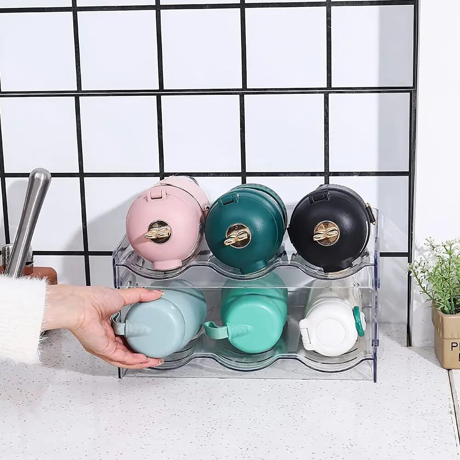 2-Layer Stackable Design: With two stackable layers and three bottle slots per tier, this rack is ideal for holding water bottles, thermoses, or sports bottles in a neat and organized way.