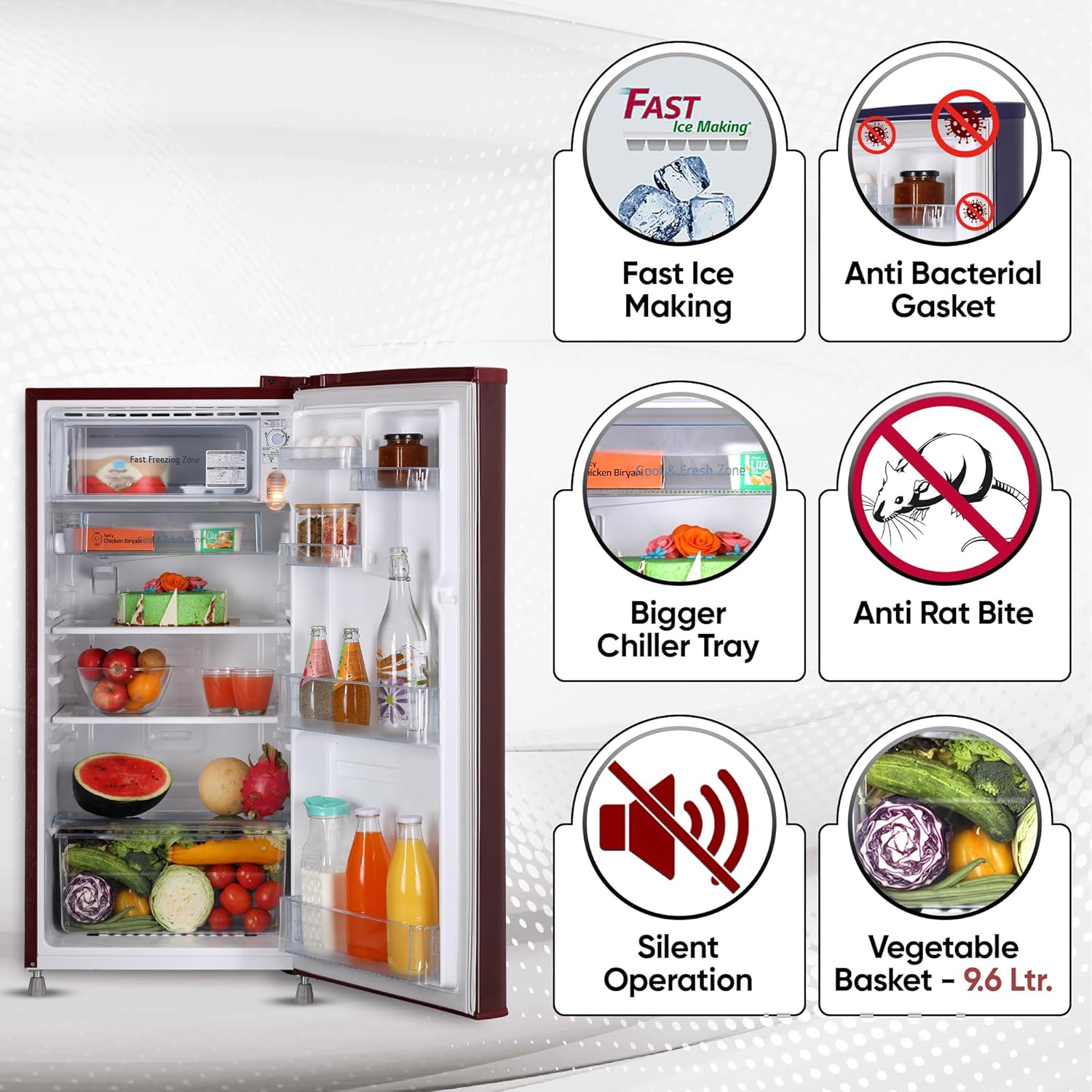 Brand Specific Features: Chiller- Transparent (Big TFR); Tray Egg- Integrated With Door Basket; Fast Ice Making; Door Lock; Handle Type- Pre colored (with Chrome cap cover); Smart Connect- connect the refrigerator to your home inverter during power cuts so that it keeps running; Solar Connect; Anti Rat Bite Type (Sleeve)