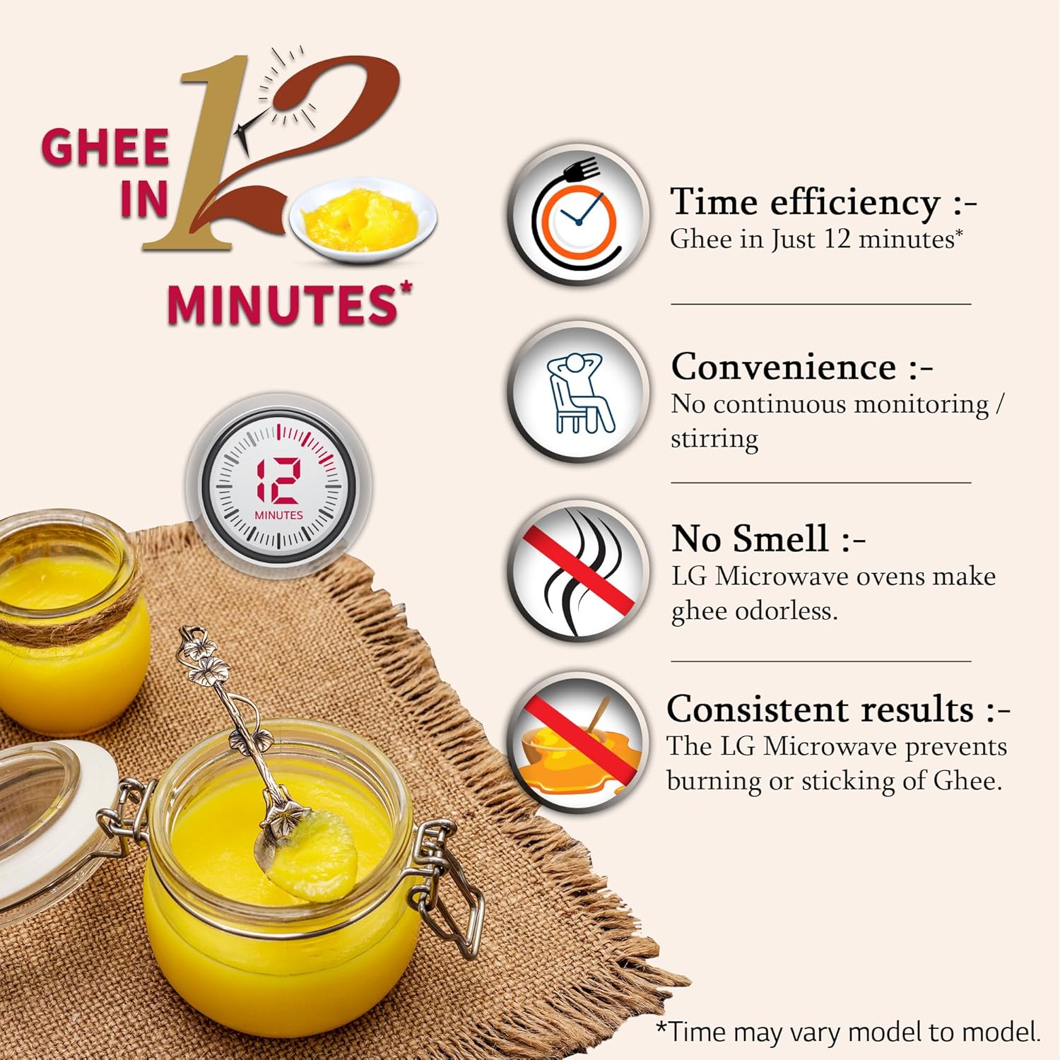 LG Microwave Ovens, making hygiene Ghee with absolutely no smell is a matter of 12 minutes*. Not just this, it also provides you with easy cooking options, added convenience, and a lot more.