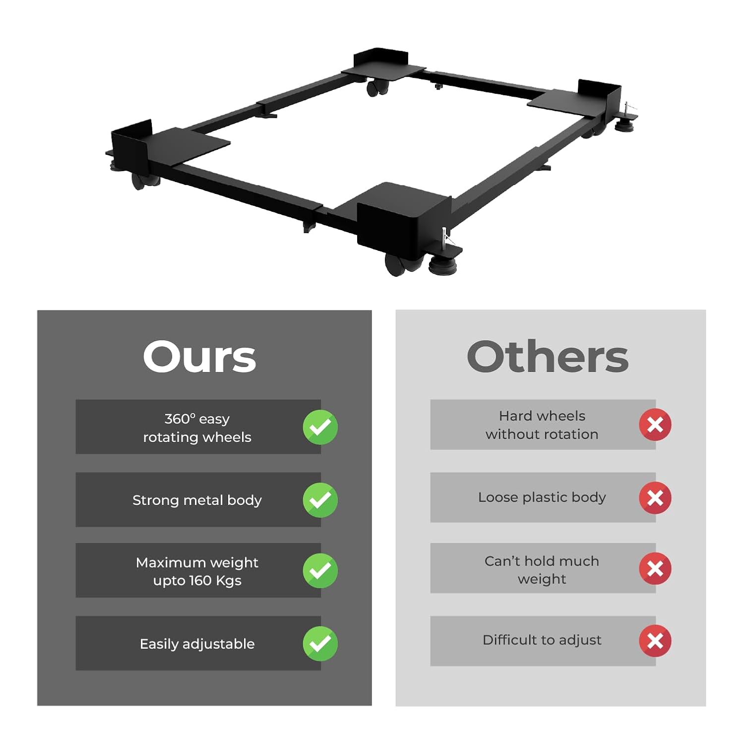 Good quality heavy stand for my 8kg washing machine. It will suites other appliances like refrigerator, cooler etc. it is value for money, size fits well as per given on product.