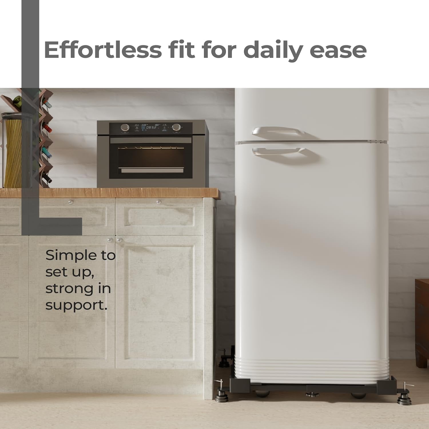 The frame was easy to fix under my washing machine. Adjustable frame made is easy to fit my washing machine size perfectly. The light but sturdy frame made has made my washing machine move easily.