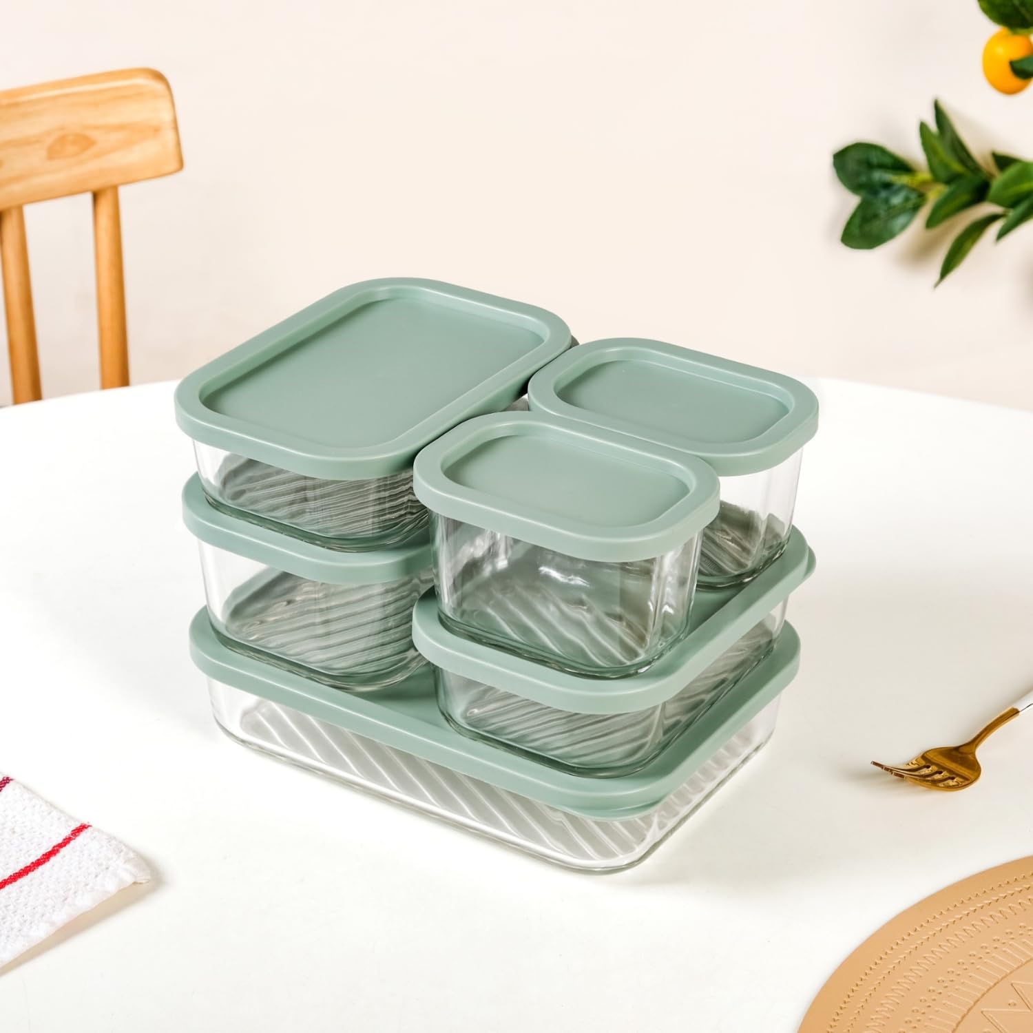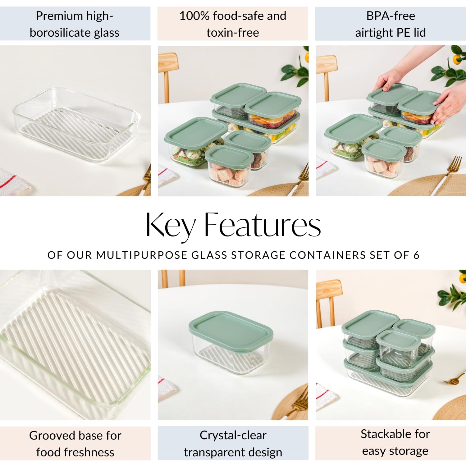 Nestasia Glass Containers for Fridge Storage Set of 6 (S-310ml x 2, M-520ml x 2, L-750ml, XL-1200ml) Transparent Stackable Glass Container with Lid, Microwave & Dishwasher Safe (Green)