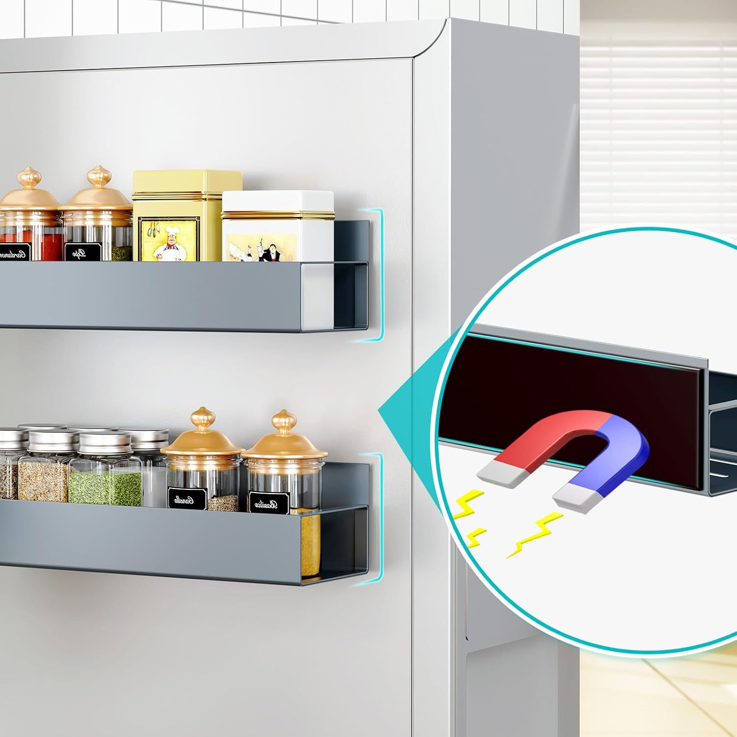 Durable Magnetic Rack with Superior Quality: Crafted from robust thick metal steel, featuring a sleek painting finish for rust resistance. Equipped with powerful magnets on the back, capable of supporting up to 1.8kg without gradual sliding down the fridge.