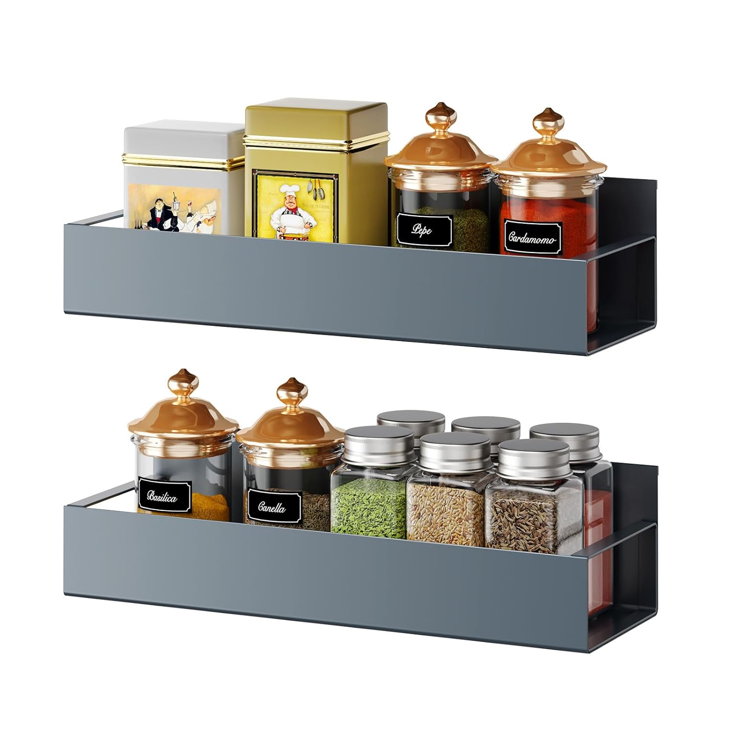 A contemporary metal spice rack designed for convenience, easily installable on the side or front of appliances like refrigerators and washing machines without the need for drilling holes. Ideal for organizing kitchen accessories, this magnetic shelf is a superb kitchen gadget, providing a stylish and practical solution.