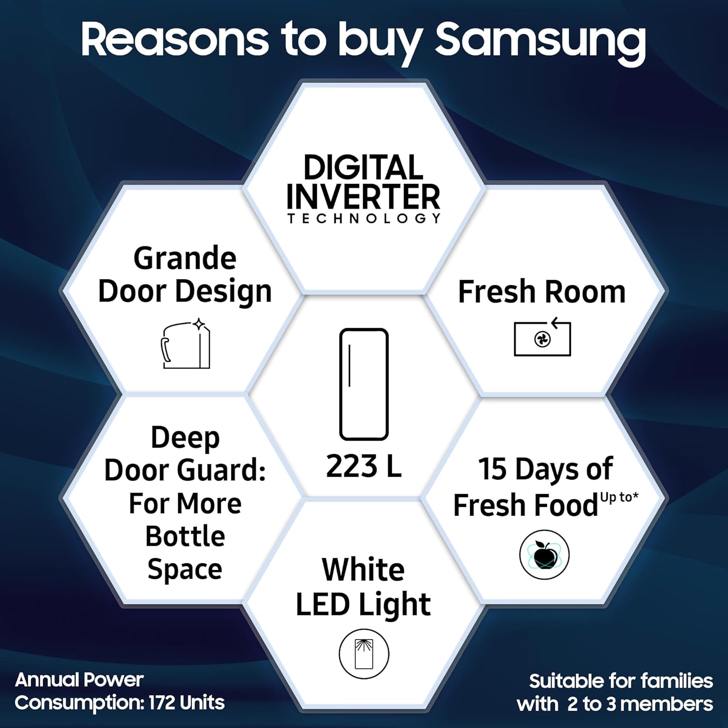 I recently purchased the Samsung 223 L, 3 Star Inverter Direct-Cool Single Door Refrigerator (RR24C2723S8/NL, Silver, Elegant Inox) 2024 Model, and I am thoroughly impressed with its performance and aesthetics. The Digital Inverter Compressor ensures energy efficiency and operates quietly, making it a perfect addition to any home.The 223-liter capacity is ideal for small families, offering ample storage space for all our refrigeration needs. The toughened glass shelves can withstand heavy loads, allowing us to store large containers without any concerns.The sleek and elegant design enhances the overall look of our kitchen, and the anti-bacterial gasket helps keep the interior hygienic by preventing the build-up of fungi and bacteria.Overall, this refrigerator combines functionality with style, making it a must-have appliance for any modern household. I highly recommend it to anyone looking for a reliable and aesthetically pleasing refrigerator.