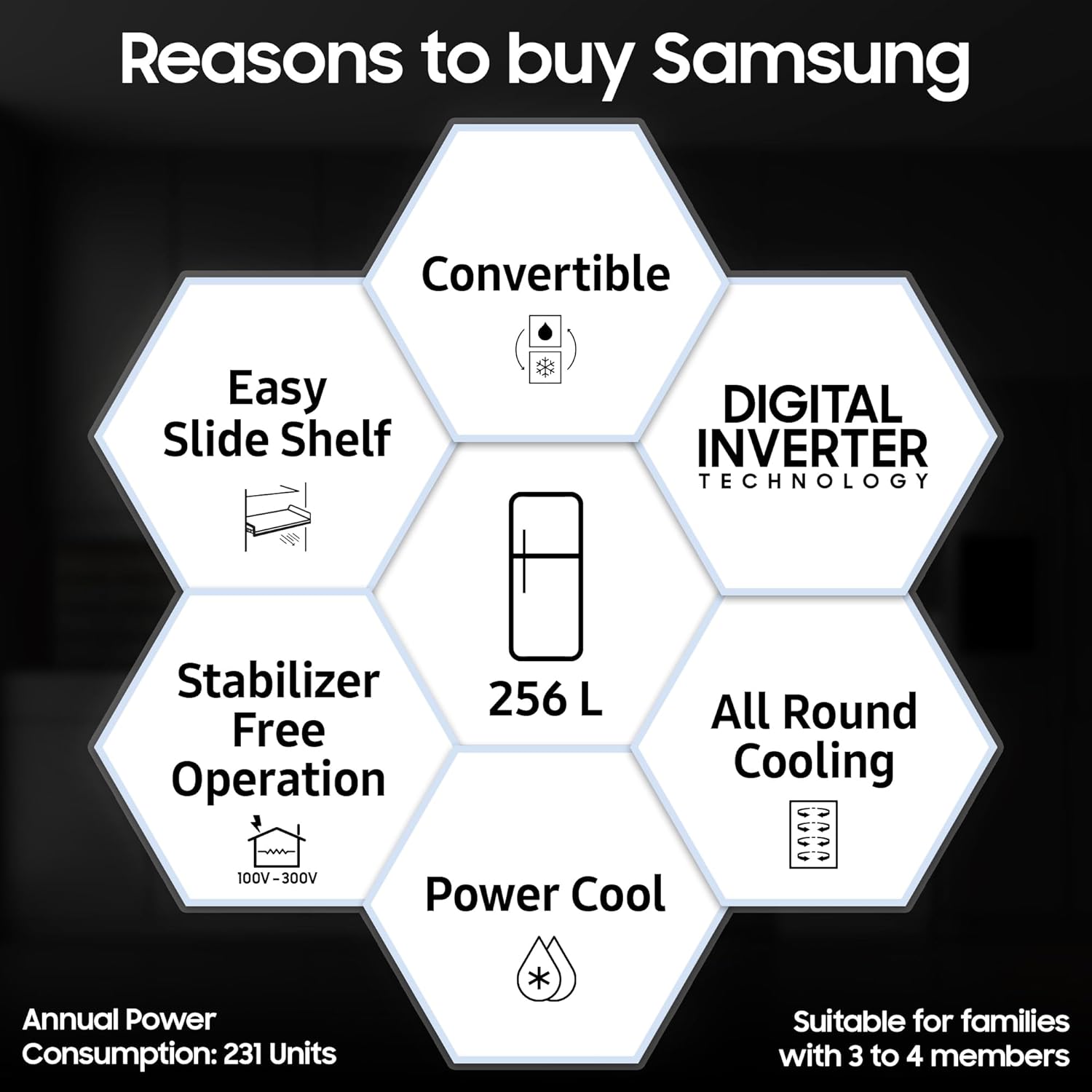 Samsung 256 L, 3 Star, Convertible, Digital Inverter with Display Frost Free Double Door Refrigerator (RT30C3733BX/HL, Luxe Black)