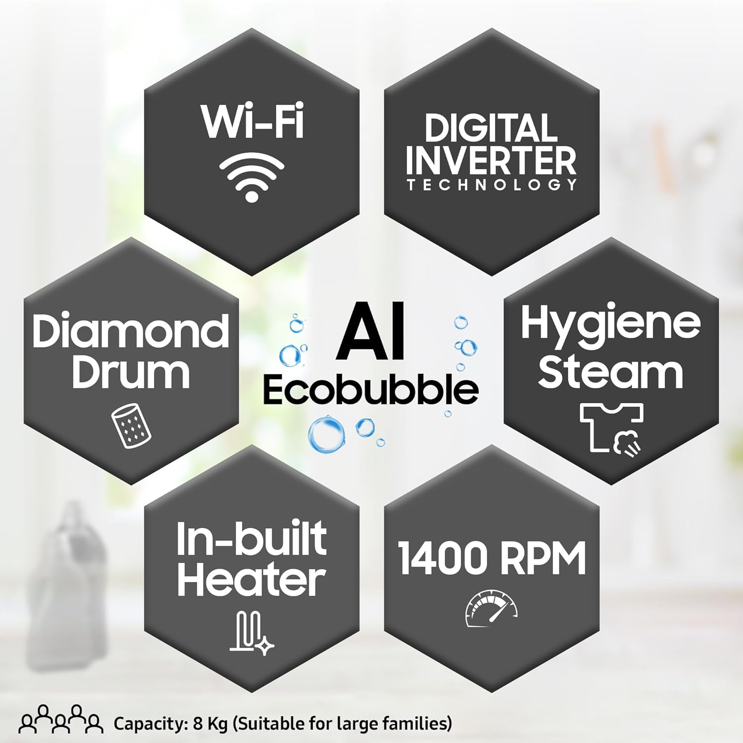 The Samsung 8 kg Fully-Automatic Front Load Washing Machine is an exceptional appliance that seamlessly blends advanced technology, energy efficiency, and convenience. Here’s a detailed review:#### **Key Features and Performance**1. **Eco Bubble Technology**This innovative feature ensures powerful cleaning even at low temperatures by creating bubbles that dissolve detergent faster, penetrating fabric more effectively. It’s a great solution for delicate fabrics and energy savings.2. **AI Control**The AI-powered control panel learns your laundry habits and suggests optimal wash cycles, making it intuitive and user-friendly. This is a huge time-saver, especially for those juggling busy schedules.3. **Wi-Fi Connectivity**The smart Wi-Fi feature allows remote operation through the Samsung SmartThings app. You can schedule cycles, get maintenance alerts, and troubleshoot without needing expert help.4. **Energy Efficiency (5-Star Rating)**This machine is built with eco-conscious users in mind, consuming minimal electricity while delivering optimal performance. The 5-star rating is a testament to its superior energy-saving capabilities.5. **Capacity**With an 8 kg drum, it’s ideal for medium to large households. The machine handles heavy loads, like bedding, with ease and delivers a thorough wash every time.6. **Build and Design**The sleek, modern design complements any home interior. The durable build and high-quality materials ensure longevity, making it a valuable investment.#### **Pros**- Excellent cleaning performance with Eco Bubble Technology.- Highly energy-efficient with a 5-star rating.- AI Control and Wi-Fi enhance usability and convenience.- Large capacity suitable for families.- Quiet operation and minimal vibration.#### **Cons**- The initial cost might be higher than some other models, but the features justify the price.- Advanced settings may take time to get used to for those new to smart appliances.#### **Verdict**The Samsung 8 kg Fully-Automatic Front Load Washing Machine is a top-notch appliance for those seeking efficiency, innovation, and durability. While it comes with a slightly premium price tag, the cutting-edge features and energy savings make it a worthwhile investment for modern households. Whether you’re a tech-savvy user or just someone who values high performance and convenience, this machine won’t disappoint.