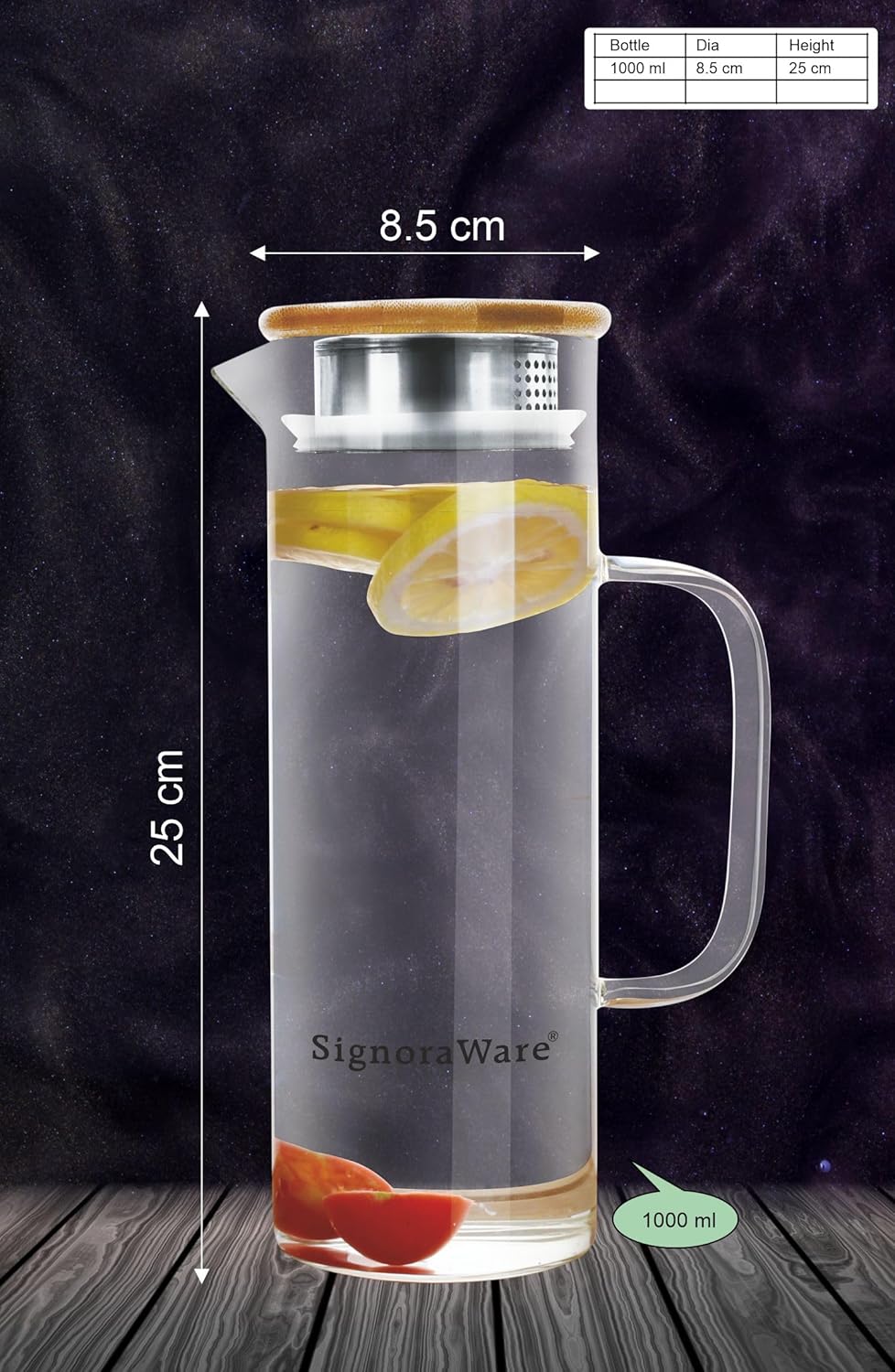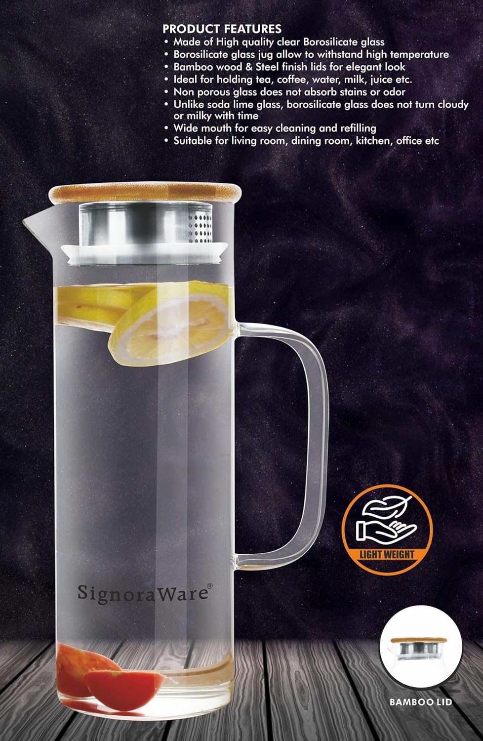 Other Details: The Signoraware Borosilicate Glass Jug comes in two elegant variants, likely featuring either a steel or bamboo lid, as mentioned in the image. This allows you to choose the perfect style to complement your home decor. Its sleek design and practical features make it an excellent choice for everyday use or special occasions.