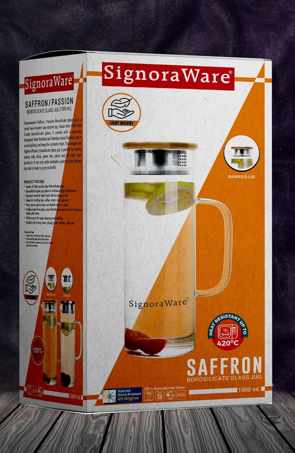 SignoraWare 1 Litres Saffron Borosilicate Glass Jug with Bamboo lid | Big Water Pitcher with Strong Handle for Water Juice Ice-Tea Milk (1000ml, Set of 1, Transparent | BPA Free)