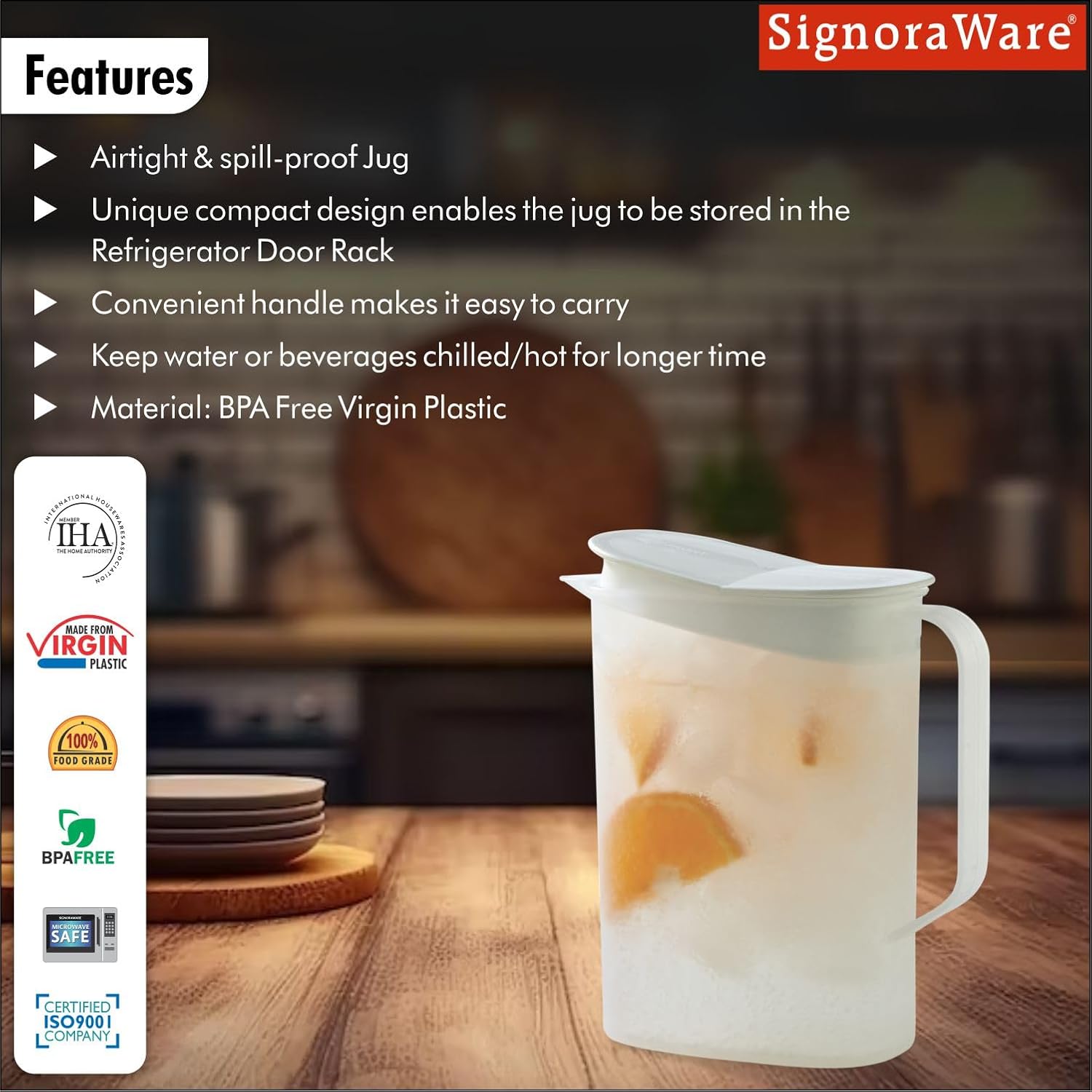 Signoraware Ocean 1.65 Litres Jug Water Storage Container Jar, Spill Proof, Liquid Tight Pourer, Bpa Free Food Grade (1650ml, White, Plastic)