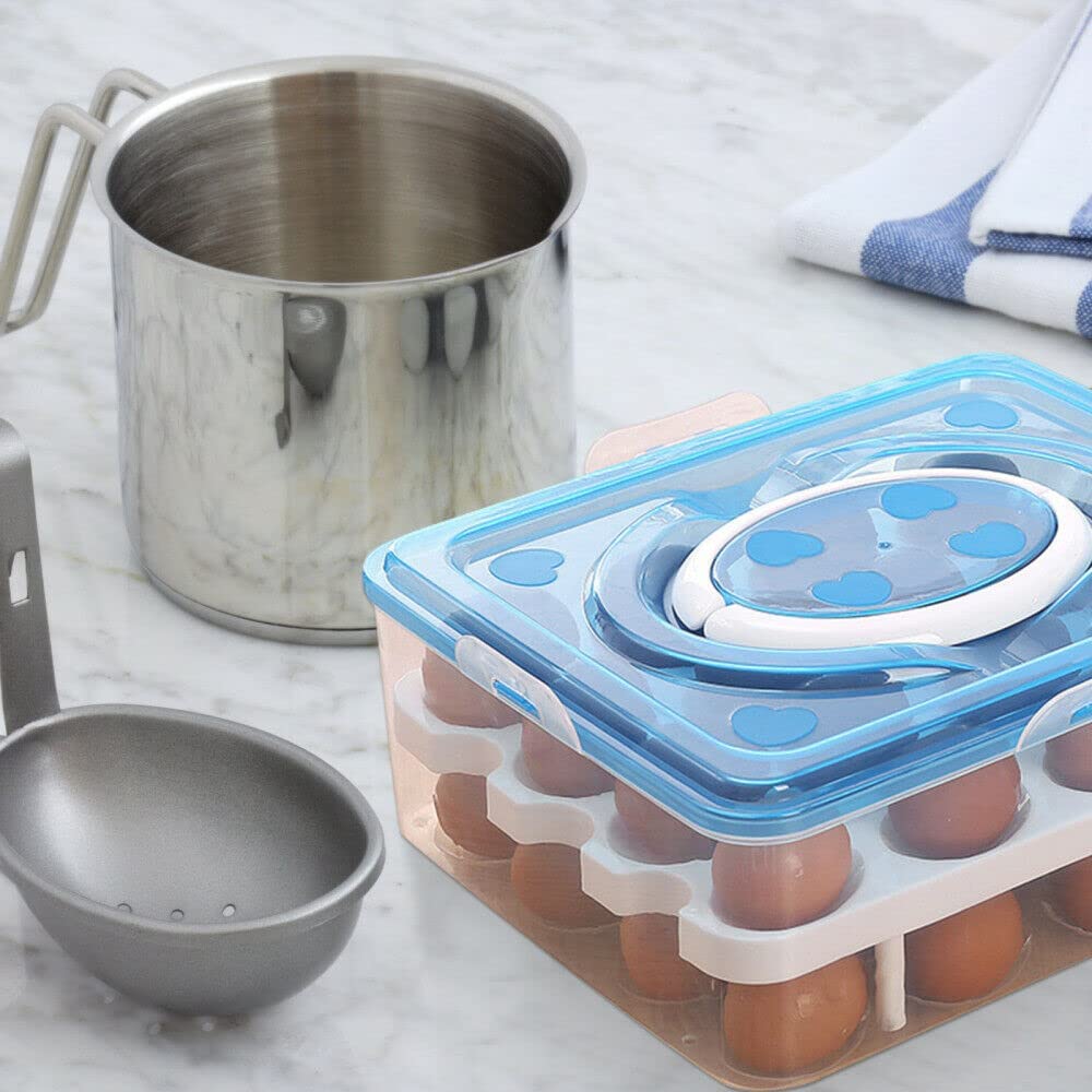 Include a 2 tier egg holder with portable lid for 32 eggs, measures 27.5 x 22.5 x 11.5 CM, it has big capacity to store eggs, and prevents eggs getting crushed or smashed.