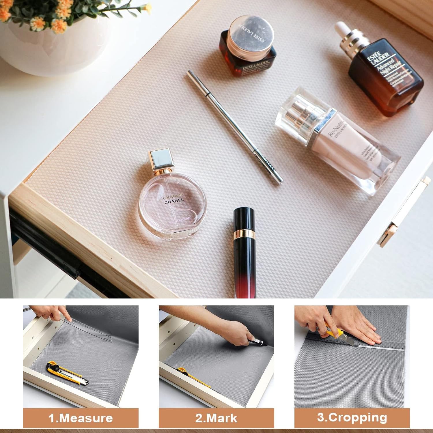 WATERPROOF AND EASY TO CLEAN: The waterproof design of this shelf liners for kitchen shelves makes it resistant to spills and moisture, keeping your shelves and placemats clean and hygienic. The kitchen shelf mats roll is effortless to clean, simply wipe or rinse it off when needed.