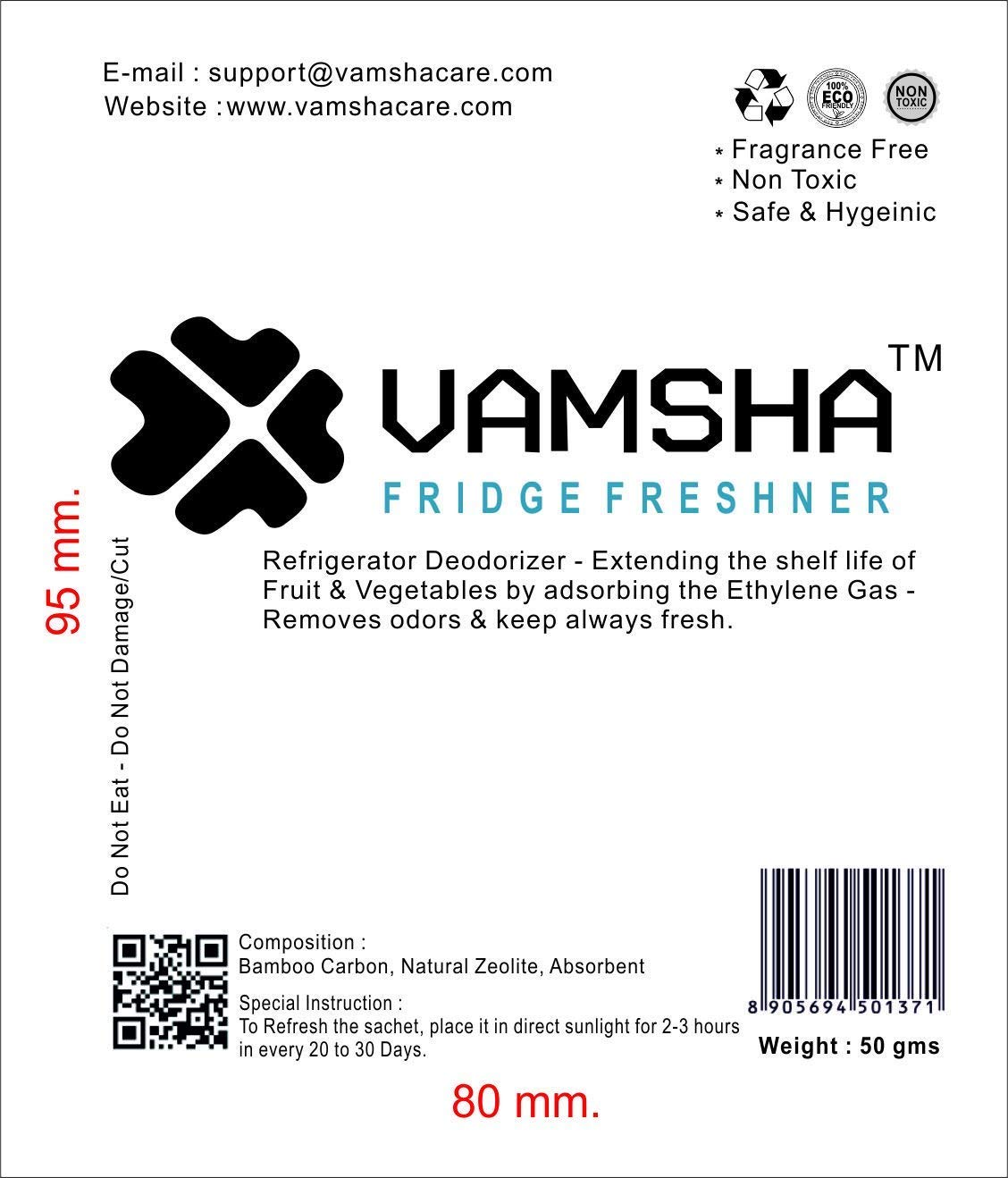 Vamsha Fridge Freshener Is Bamboo Charcoal based Fridge and Freezer odour absorber is 100 % Natural and Non Toxic Absorber, This Tyvek Sachet helps keep your food tasting like it should. The removable front and back panels let air flow through the box without messy spills. . For maximum Absorbing and freshening power. Fridge Freshener is an innovative manufacturing process blends the bamboo carbon into a single moulded natural zeolite element that’s dust free for guaranteed food safety. Fridge Freshener Powerful odour control for your Refrigerator or freezer. Fridge Freshener effective natural alternative to eliminating odours and provides clean, fresh air without the use of fragrances or chemicals. Intended for single use and lasts up to 12 months. This refrigerator odour remover deodorizer really works!