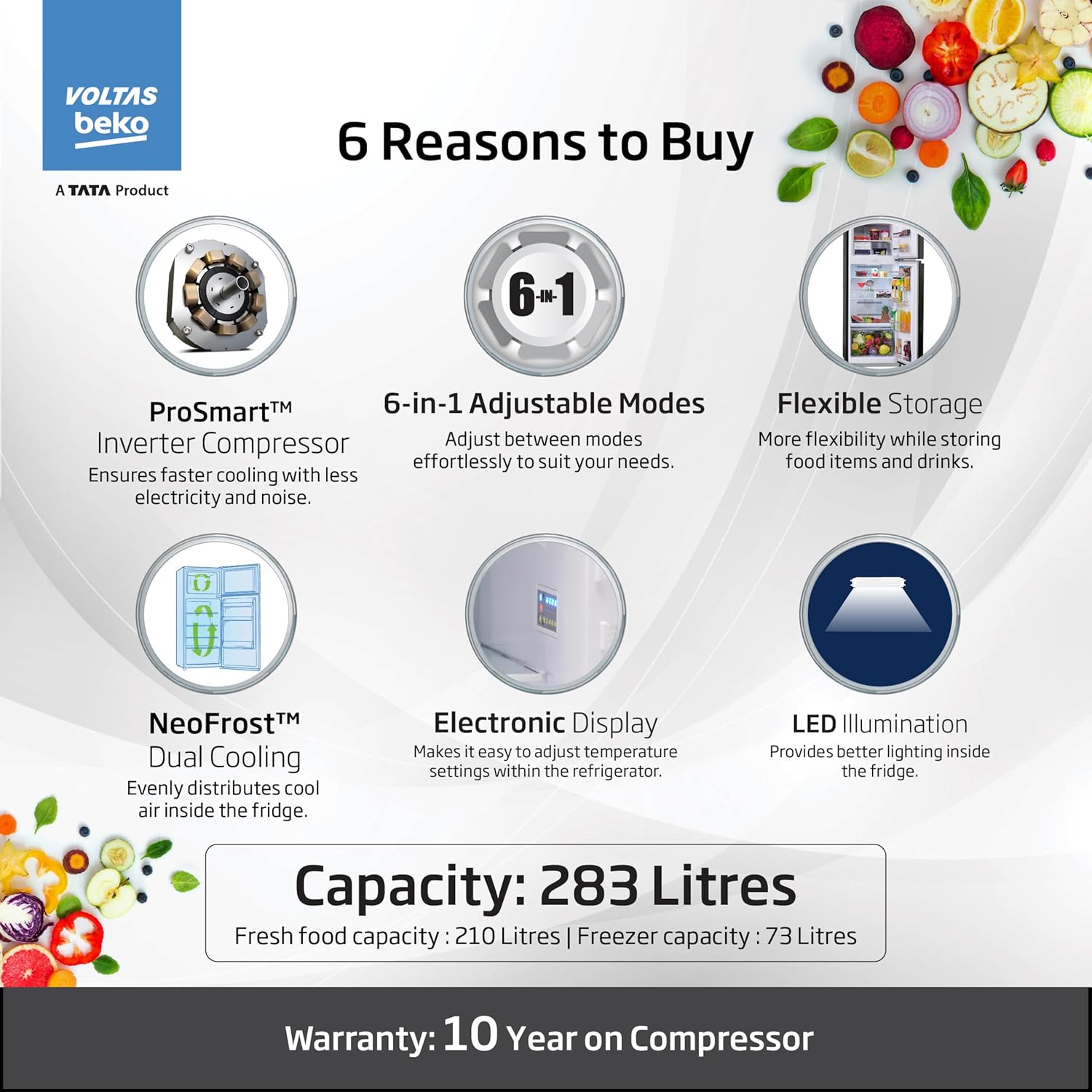 Voltas Beko, A Tata Product 283 L, 2 Star, 6-in-1 Adjustable Frost Free Inverter Double-Door Refrigerator (RFF334D/WPV100RXBD, Wooden Black)
