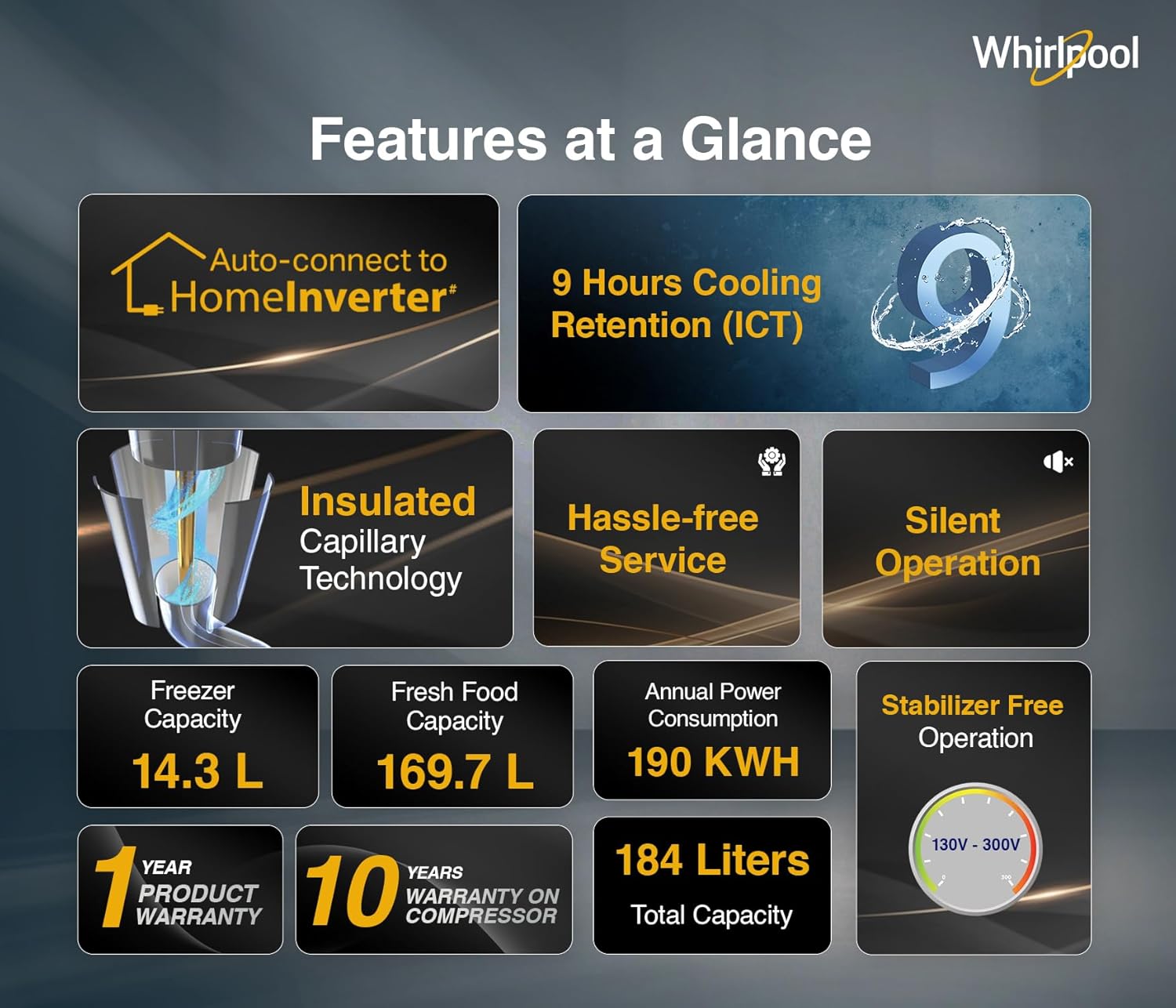 Brand Specific Features – Upto 9 hours of cooling retention during power cuts, Easy Manual Defrosting, Jumbo Storage Up To 3, 2L Bottle Storage, Insulated Capillary Technology, Auto Connect To Home Inverter, Large Vegetable Crisper, Honey Comb Lock In Technology & Quick Chill Zone